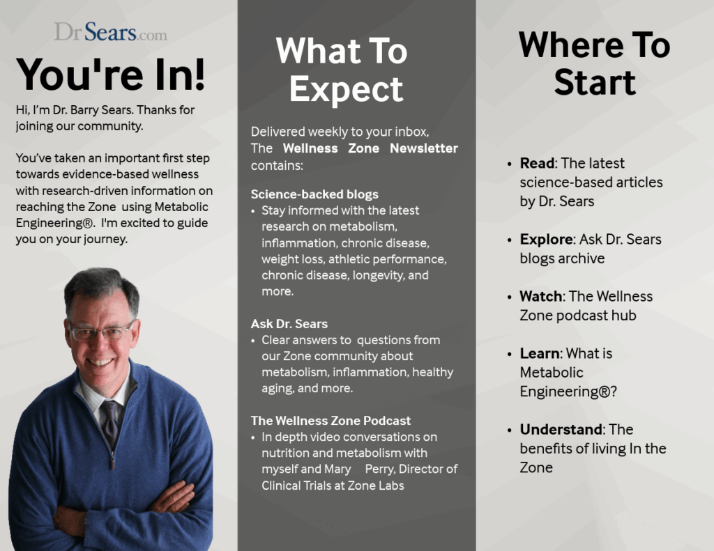 Welcome, New Subscriber! Begin Your Journey on DrSears.com: Read: Latest science-based articles by Dr. Sears Explore: Ask Dr. Sears blogs archive Watch: The Wellness Zone podcast hub Learn: What is Metabolic Engineering®? Understand: The benefits of living in the Zone